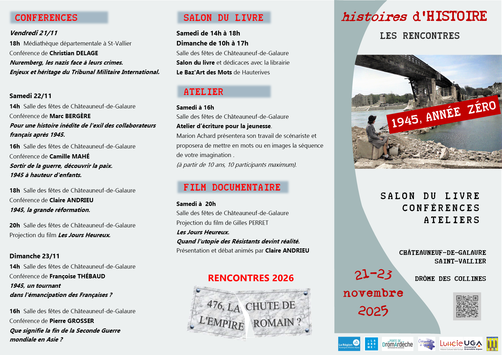 La médiathèque de St Vallier nous recevra pour la conférence d’ouverture le vendredi 21 novembre. Puis nous poursuivrons les Rencontres samedi 22 et dimanche 23 à Châteauneuf de Galaure.